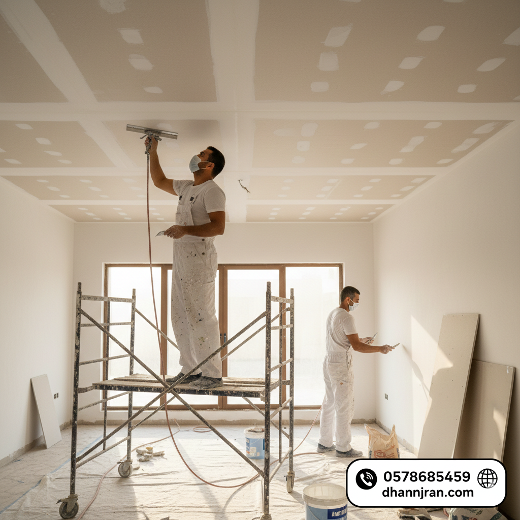 • أدوات حديثة: نستخدم ماكينات الرش الحديثة وصنفرة الجدران الآلية لضمان ملمس ناعم جداً.